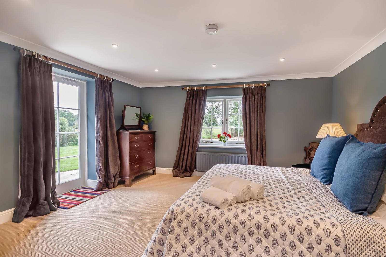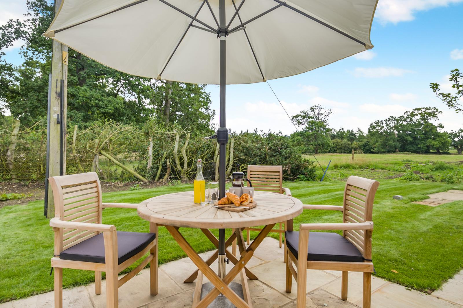 French doors lead from the bedroom to the private patio and garden facing the field, peppered with its unique collection of ancient oak trees. Here you can also enjoy a romantic dinner under the stars. There is private off-road parking for one car.